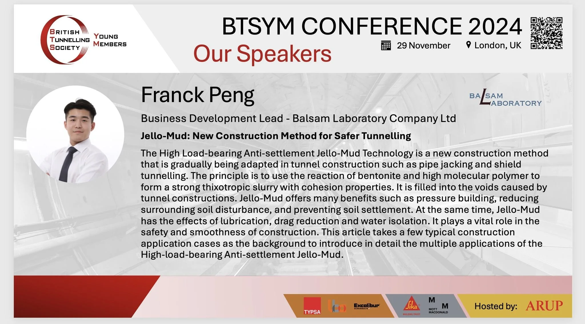 We are excited to announce that we will be speaking at the BTSYM Conference 2024 in London, UK, on November 29th. During this prestigious event, we will be presenting our innovative grouting technique, "Jello-Mud," to the European tunnelling community for the very first time. This novel approach promises to significantly enhance efficiency and safety in grouting applications, and we look forward to sharing our findings and experiences with contractors, engineers, and professionals in the field.